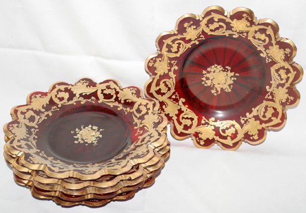 FRENCH RUBY CRYSTAL & GOLD PLATES, DIA 9 1/8"