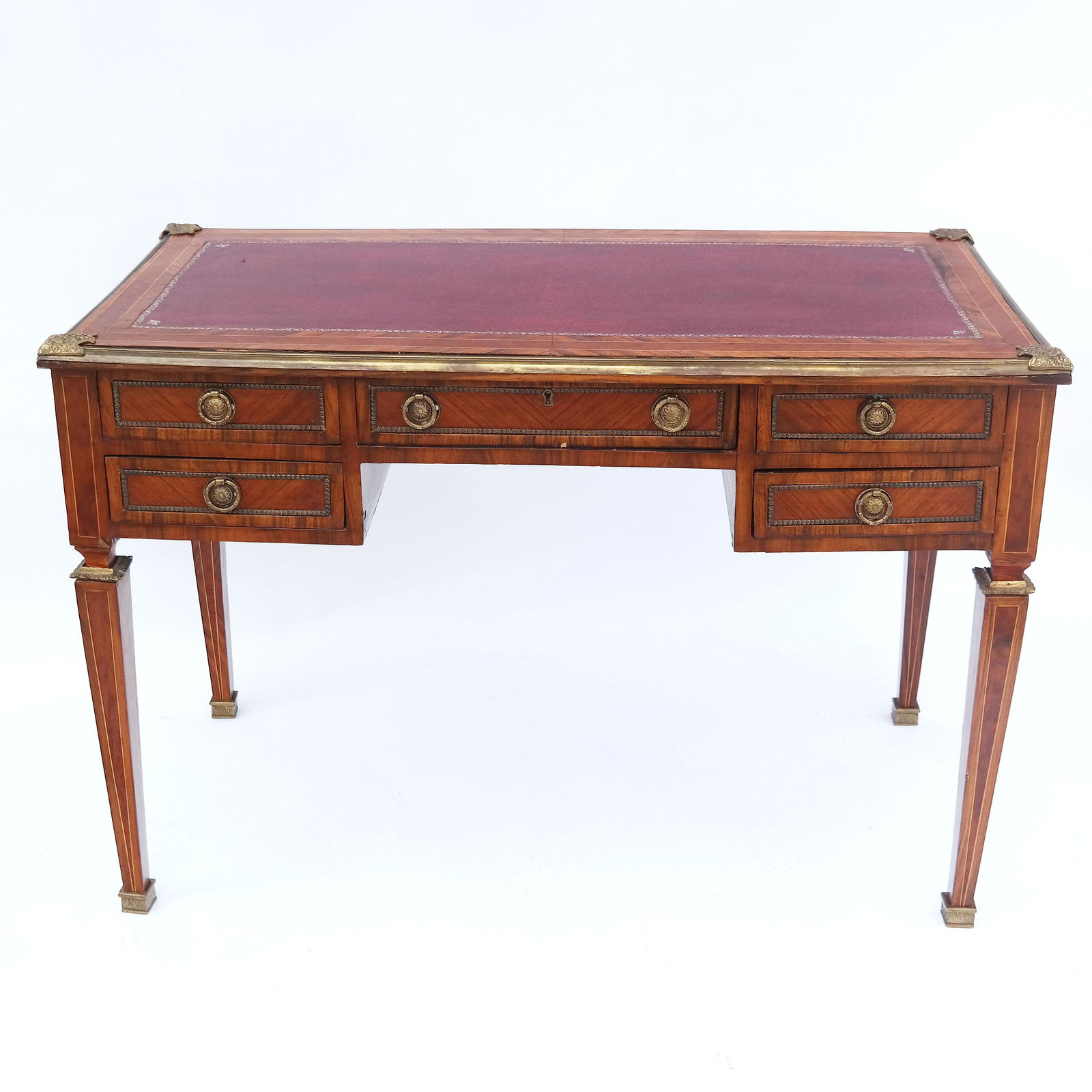 SoldFrench Style Bureau Plat Desk Inlaid Brass Trim. Gilt oFrench Style Bureau Plat Desk Inlaid Brass Trim. Gilt ormolu escutcheons and feet. Single long drawer-- Dimensions: H: 30.5 inches: W: 44 inches: D: 27 inches ---See Sold Price