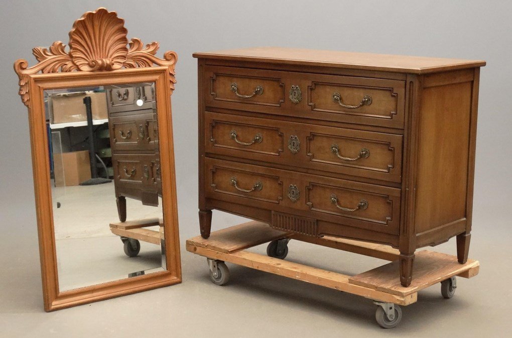 Sold1930'S 4 DRAWER FRENCH STYLE CHESTFRENCH STYLE 4 DRAWER CHEST / DRESSER. WITH MIRROR. MINOR WEAR TO FINISH, MISSING PIECE OF MOULDING. 50" W x 22" D x 36" H. THIS ITEM EXCEEDS SIZE LIMITATIONS FOR IN HOUSE SHIPPING.See Sold Price