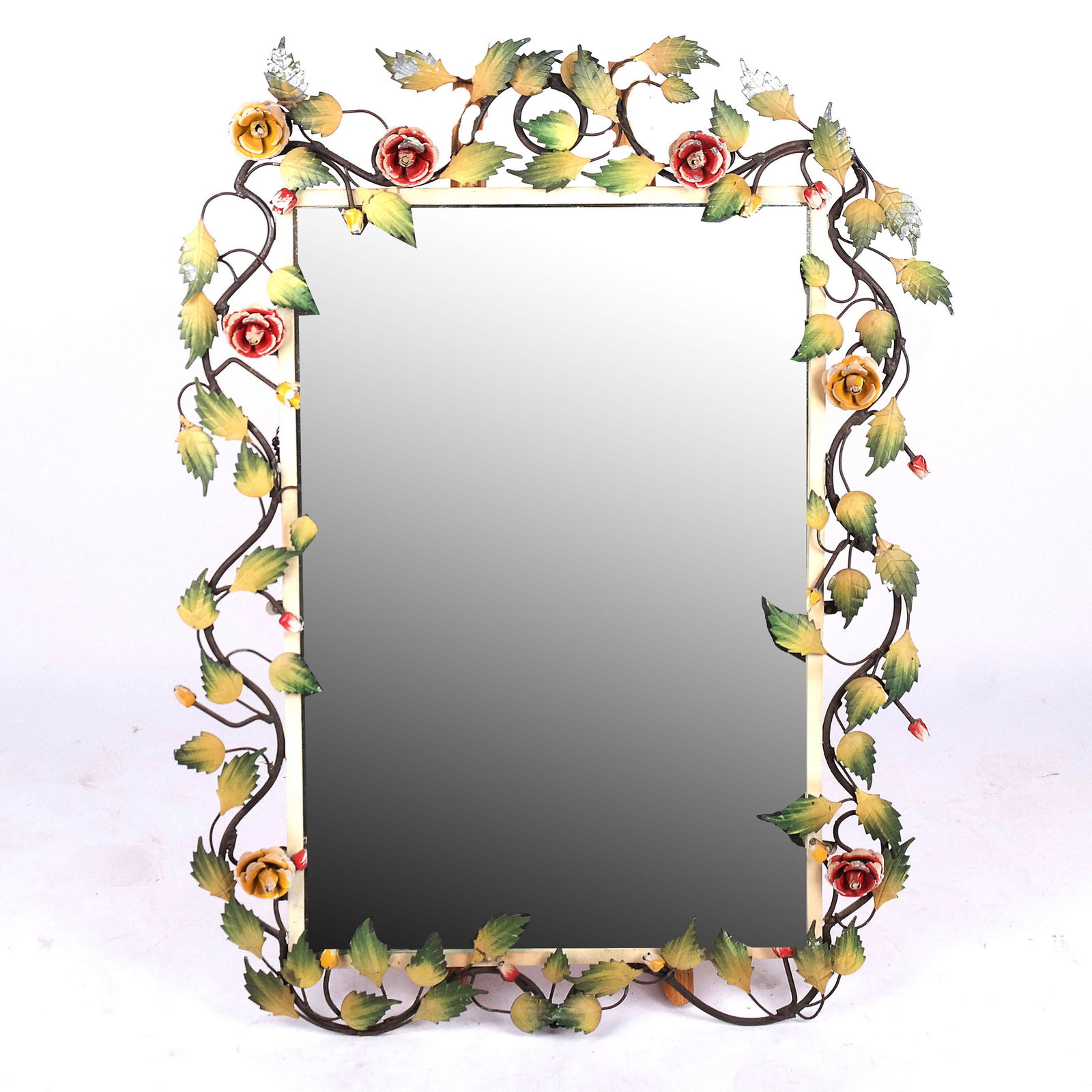 SoldFrench-Style Dee Tole MirrorPainted tole mirror in flowers and leafy vine frame. [39" H x 29" W]. In good condition.See Sold Price