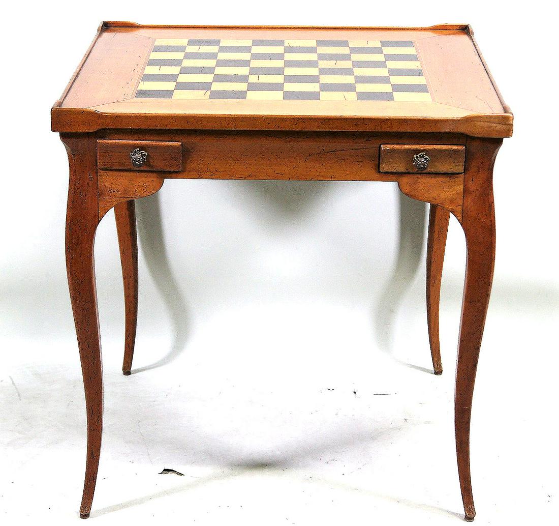 French Inlaid Kingwood Louis XVI Style Games Table, 20th c., the crotched inlaid folding top openingFrench Inlaid Kingwood Louis XVI Style Games Table, 20th c., the crotched inlaid folding top opening to a dark blue tooled leather gaming surface, above a central gilt tooled leather slide, flanked by
