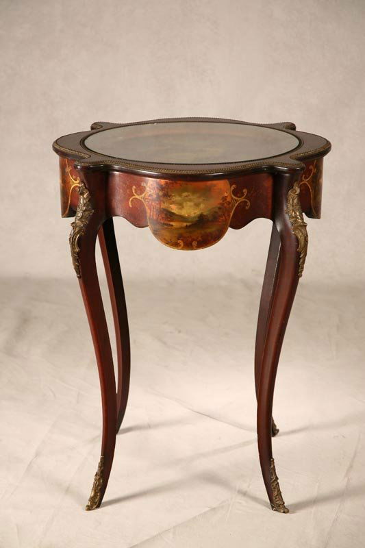 FRENCH STYLE STAND. Top has round handpainted sce