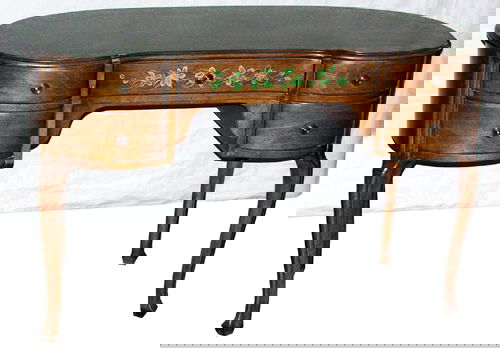 French Louis XV Style Marquetry inlaid Carved Walnut Dressing Table, 20th c., H.- 30 1/4 in., W.- 32French Louis XV Style Marquetry inlaid Carved Walnut Dressing Table, 20th c., the central lifting top with and interior mirror, flanked by two lifting lid compartments, over a pullout writing slide ab