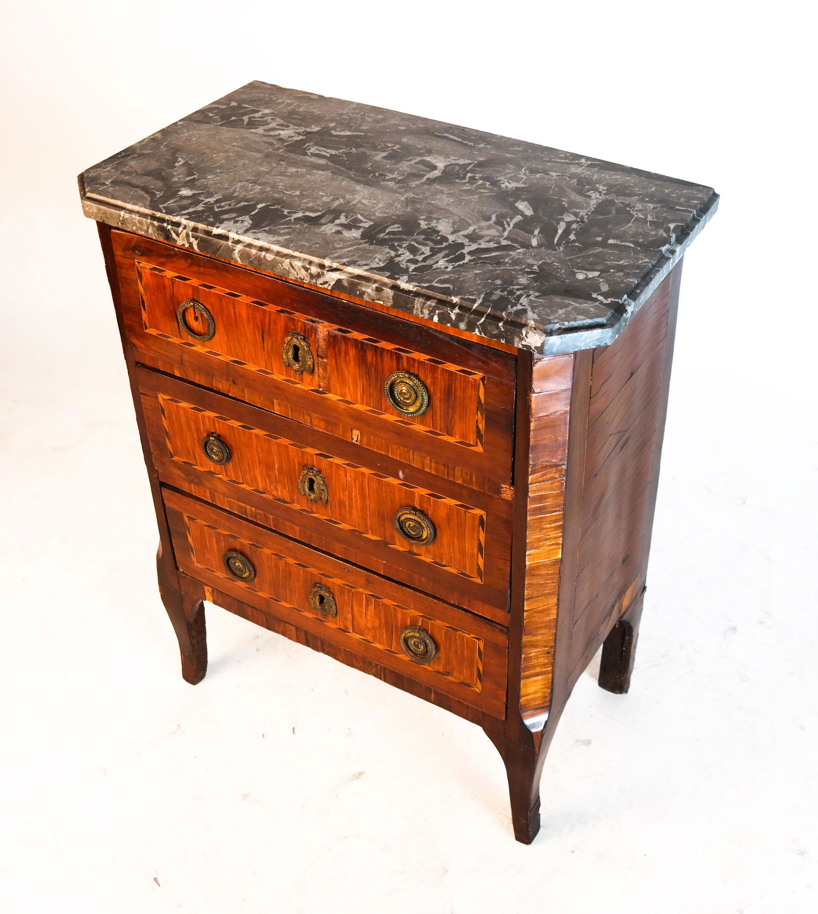 French Transitional Louis XV/XVI Style Marble Top Parquetry Commode, 20th c., H.- 32 1/2 in., W.- 39French Transitional Louis XV/XVI Style Marble Top Parquetry Commode, 20th c., shaped white marble top with canted corners, conforming case, three lower drawers, cabriole legs with sabot, joined by a m