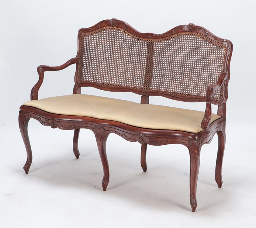 SoldFRENCH WALNUT AND CANE OPEN ARM SETTEE C 1840.French walnut and cane open arm settee C 1840. Ht: 38.5" Wd: 52" Dpth: 25" Seat: 19"See Sold Price