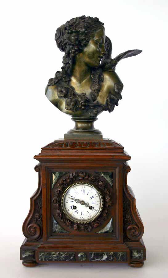 French Walnut & Marble Clock with Bronze Bust