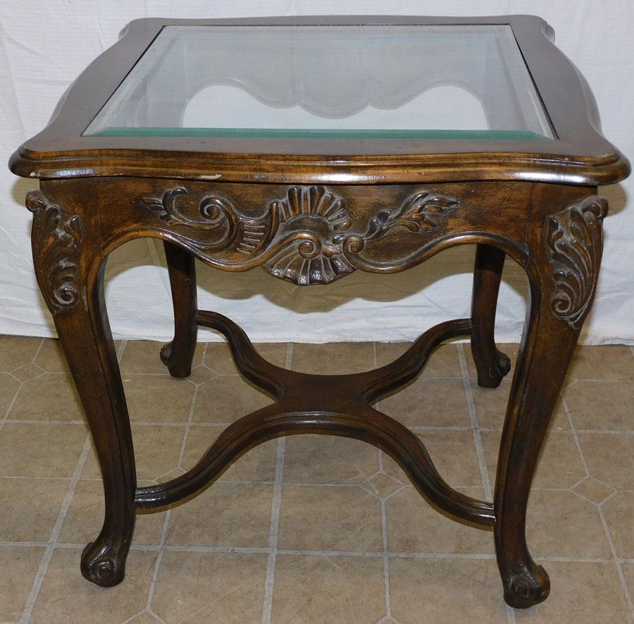 French Walnut Carved Glass Top Table