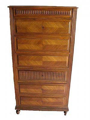 SoldAntique Drop Front Secretary Desk ChestButlers Chest, fall front chest, molded mahogany Top over oval inlaid fall front. french polished Walnut wood closed as chest , cabinet, side board, brass pulls and side buttons release drop front desSee Sold Price