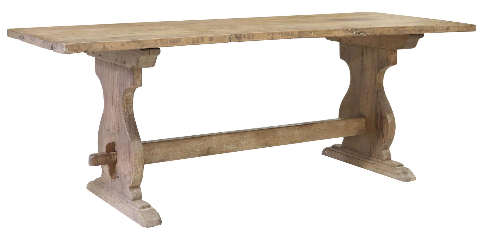 SoldFRENCH MONASTERY OR REFECTORY TRESTLE TABLE, 78.75"LFrench walnut refectory/ monastery table, early 20th c., having thick rectangular top, raised on turned trestle supports, ending on bridge feet joined by cross stretcher, wedged mortise and tenon joinSee Sold Price