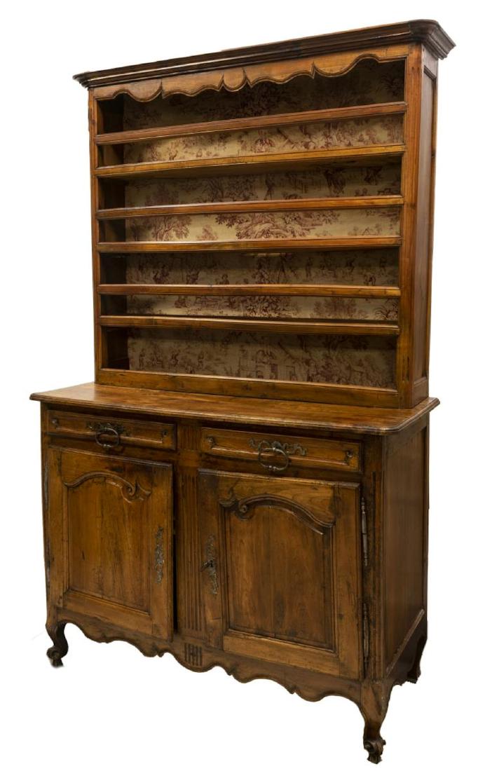 Unusual Diminutive French Louis XV style Carved Walnut Vaisselier, 19th c., the arched finialed crowUnusual Diminutive French Louis XV style Carved Walnut Vaisselier, 19th c., the arched finialed crown over a back with four scalloped plate racks, on an ogee edge rounded corner base with three frieze