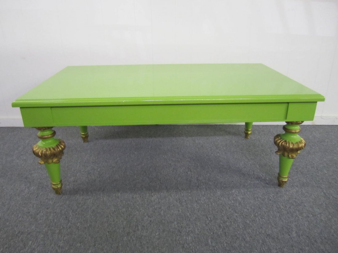 SoldKarl Springer Lacquered Large Cocktail TableModern green marble-look wide, low table.Makers mark on bottom.White accents on end of each leg. Imperfections.Height: 16 1/2"; Width: 60"; Depth: 36". (coffee table, furniture, mid-century)STERLING ASee Sold Price