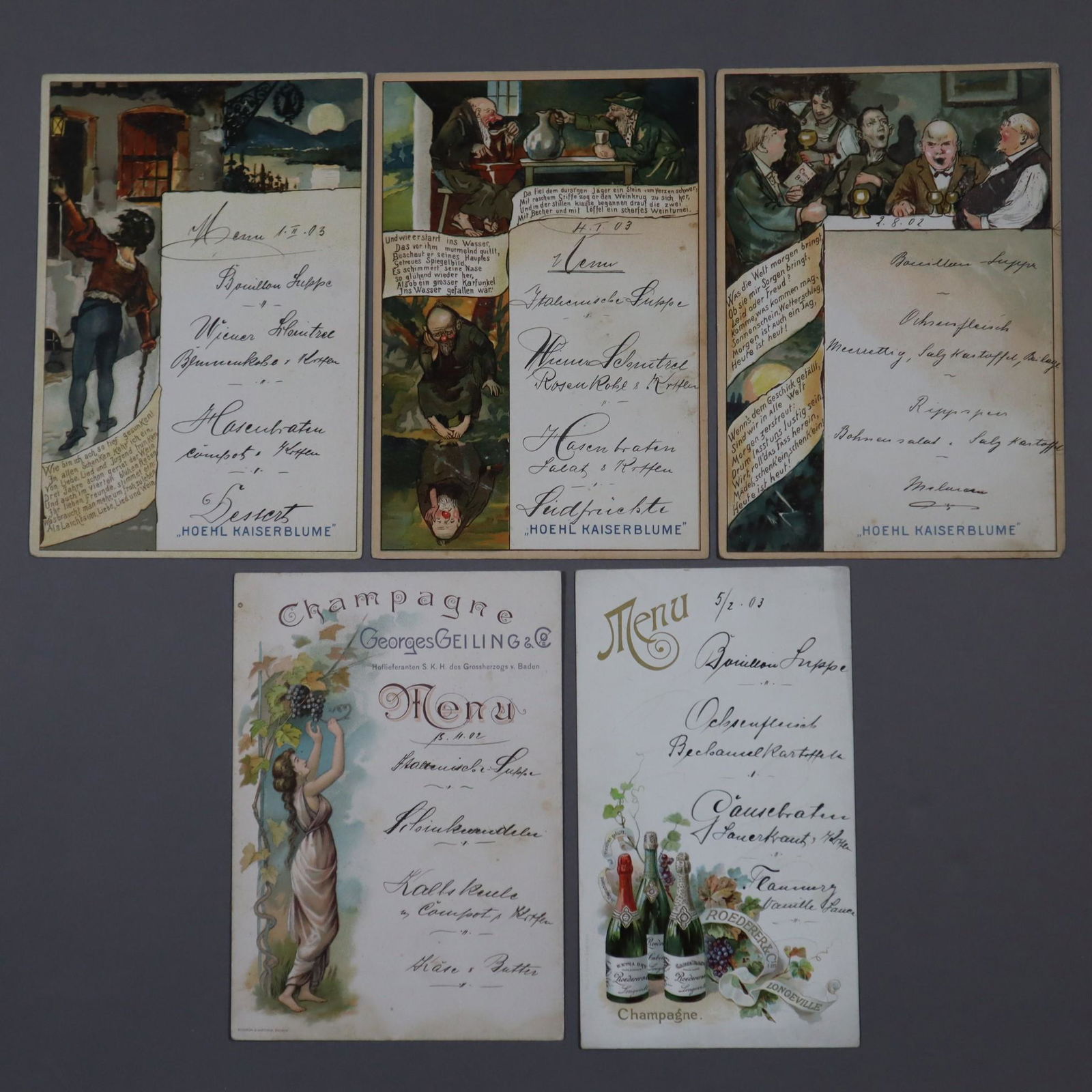 Fünf alte Menükarten - datiert 1902/1903,