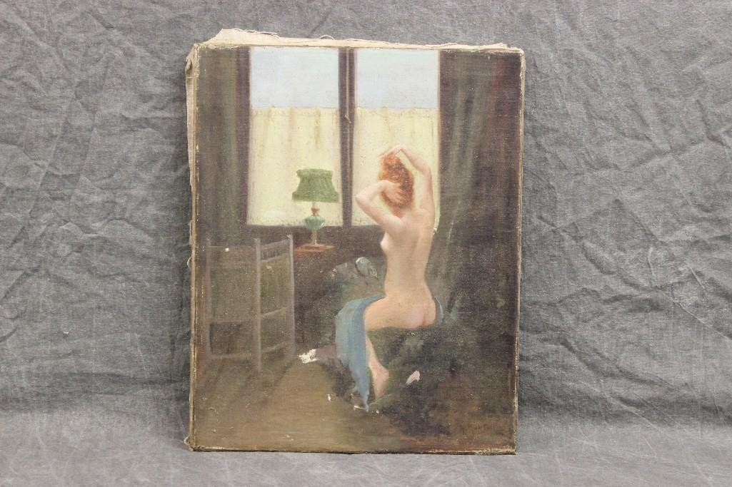 SoldCARL PICKHARDT (AMERICAN, 1908-2004).Pair of oils to include: "Seated Nude", oil on canvas board, 1947, initialed lower right, signed, dated, and titled verso, warping, craquelure, frame abrasion, 18" high x 14" wide;See Sold Price