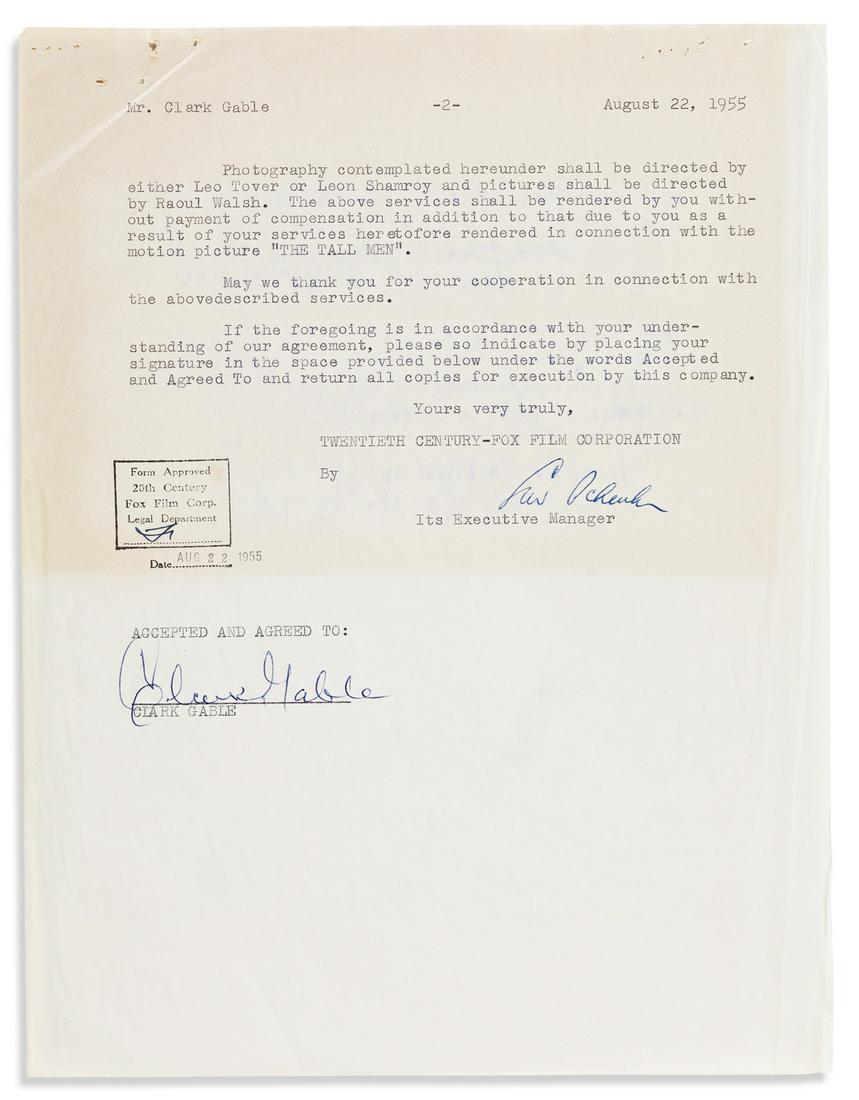 GABLE, CLARK. Typed Document Signed, agreeing to