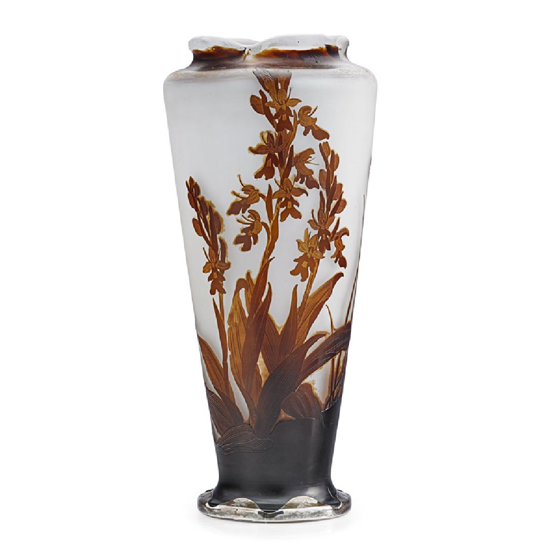 EMILE GALLE French Cameo Glass Miniature Cabinet Vase. Sterling Silver Rim. Thistle motif. Signed. SEMILE GALLE French Cameo Glass Miniature Cabinet Vase. Sterling Silver Rim. Thistle motif. Signed. Silver Hallmarked with flying eagle and diamonds with letters. Dimensions: Height: 2.75 inches, Width