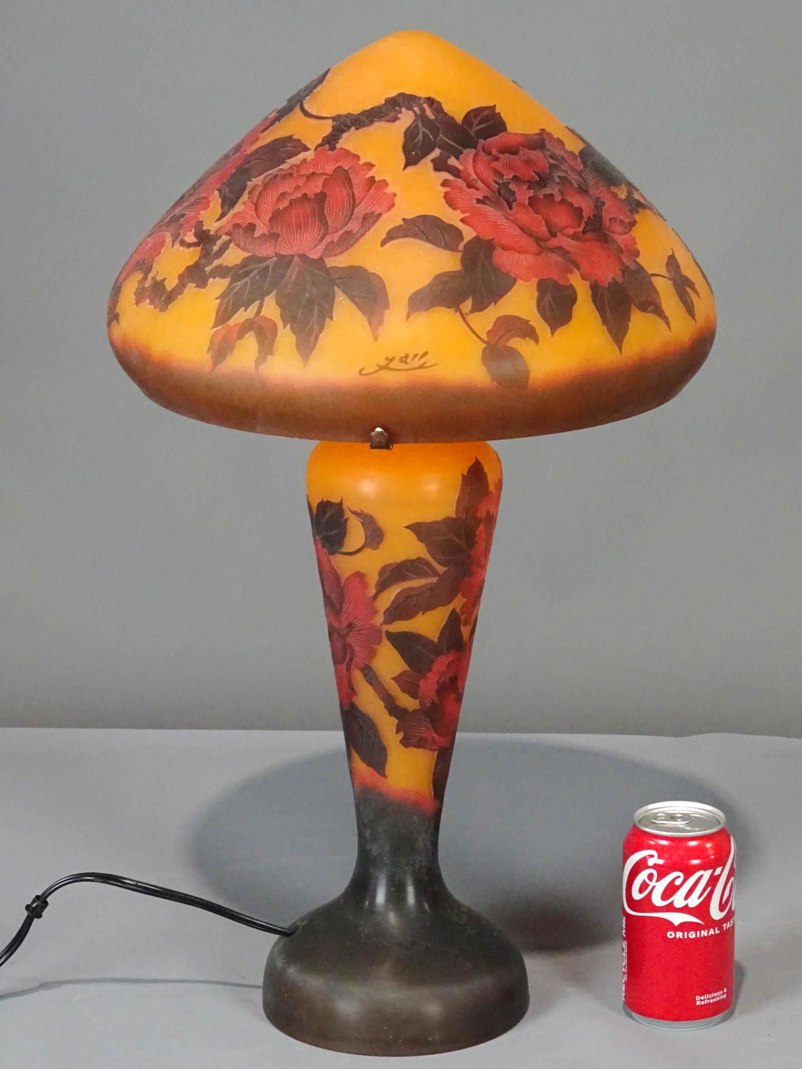 SoldLARGE GALLE STYLE ART GLASS TABLE LAMPLARGE CONTEMORARY AFTER GALLE CAMEO GLASS TABLE LAMP DECORATED WITH FLOWERS & MUSHROOM SHADE - 12 1/2' x 30 1/2"See Sold Price