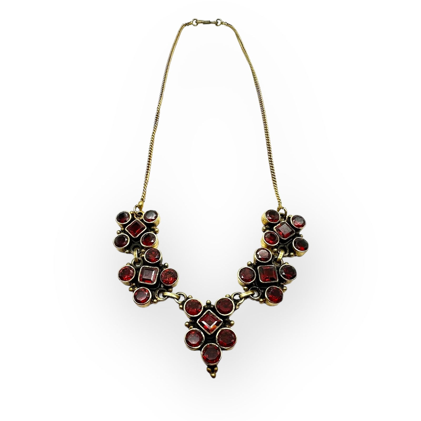 SoldVictorian 1880s Bohemian Garnet Silver NecklaceVictorian Bohemian garnet and 800 silver necklace dating to circa 1880s. Composed of linked clusters of rose-cut pyrope garnets set in darkened silver, arranged in symmetrical patterns typical of theSee Sold Price