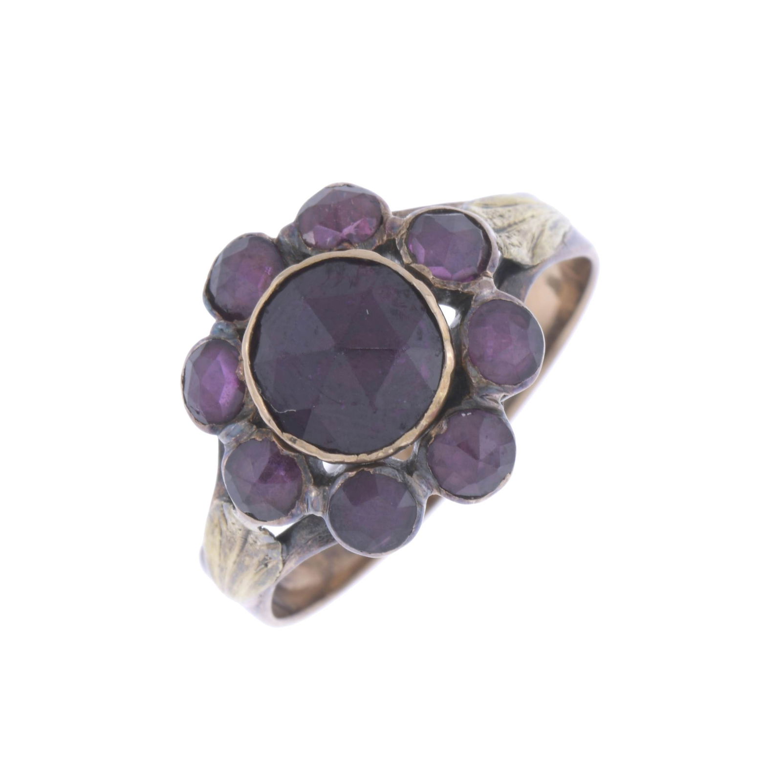 GARNETS ROSETTE RING, EARLY 20TH CENTURY.