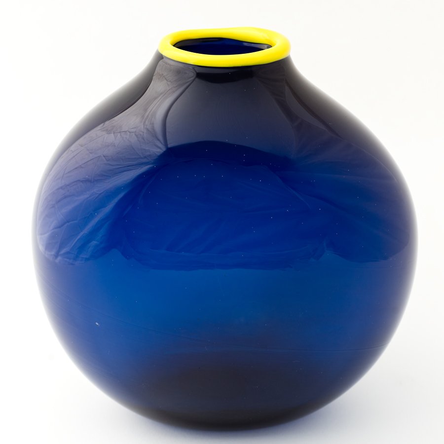 SoldGARRY NASH, SIGNED BLUE MURRINE FLAT GLASS VESSELGary Nash (New Zealander, born 1955). Untitled - Murrine and Cane Flat Vessel, blown glass, signed to underside. Approximate dimensions: h. 20.625", w. 20.5", d. 5.5".See Sold Price