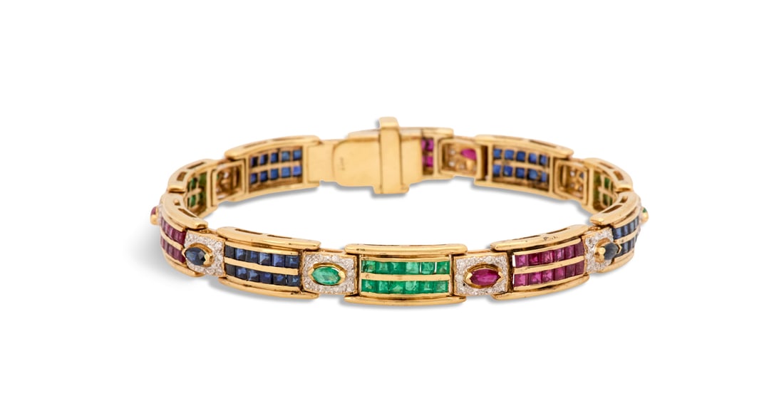 RUBY SAPPHIRE EMERALD BRACELET WITH DIAMONDS 14K YELLOW GOLD BAR LINK 10.35CTModern Jewelry4.5(204)See Sold PriceJul 13, 2025