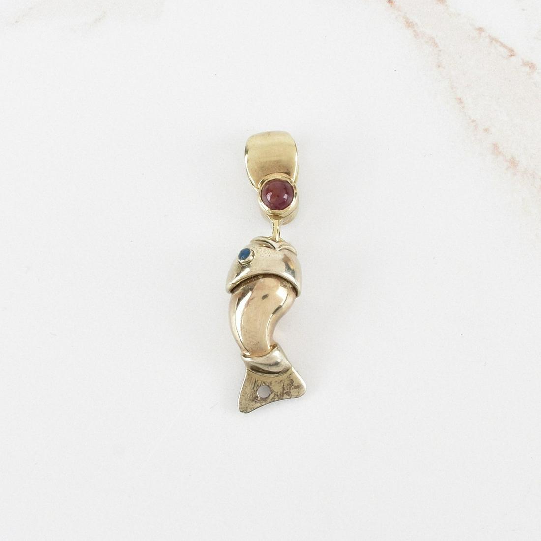 Sold18k Yellow Gold Vintage Articulated Fish PendantAn 18k yellow gold fish charm pendant featuring intricately etched, articulated details that bring the design to life. The fish's eyes are adorned with red ruby-like gemstones, adding a striking contrSee Sold Price