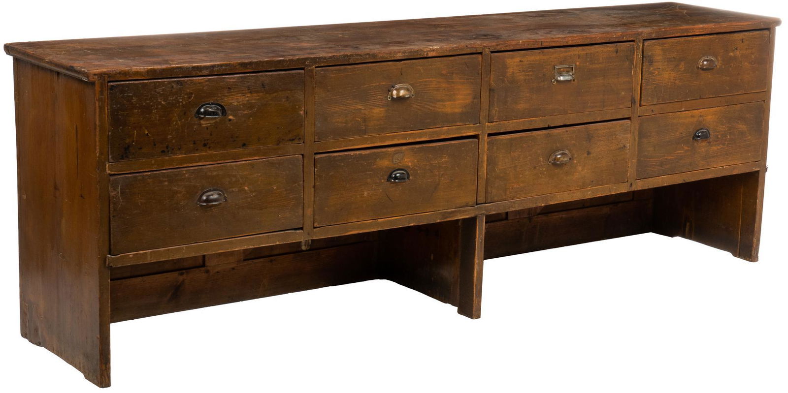 SoldGeneral Store CounterGeneral store counter, with oversize top, over ten drawers, with metal pulls, supported on plinth base height 31 in. x width 115 in. x depth 30 in. We happily provide seamless shipping services onSee Sold Price