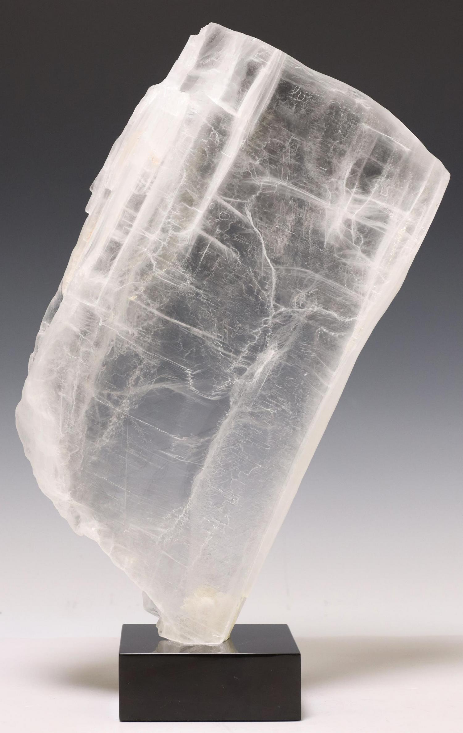 SoldGEOLOGICAL WINDOWPANE SELENITE SPECIMEN ON BASEWindowpane selenite geological specimen, on black marble base, specimen: approx 14.75"h, 12"w, 1"d, overall: approx 16.25"h, 12"w, 4"d, 10lbs Start Price: $200.00See Sold Price