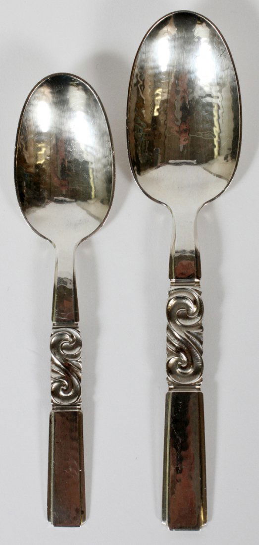 Sold48 Pc. Georg Jensen "Scroll" Sterling Silver SetBeautiful 48 Pc. Denmark Georg Jensen "Scroll" pattern sterling silver flatware set. Set includes (8) Dinner Forks, (8) Salad Forks, (16) Teaspoons, (8) Dinner Knives and (8) Oval Soup Spoons. Set isSee Sold Price