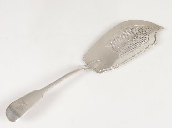 SoldGeorge III Sterling Silver Fish ServerGeorge III sterling silver fish server, circa 1808 by John Salkeld, fiddle pattern, with and engraved crest and reticulated blade, 12.25 inches, approximately 3.7 ounces troy.See Sold Price