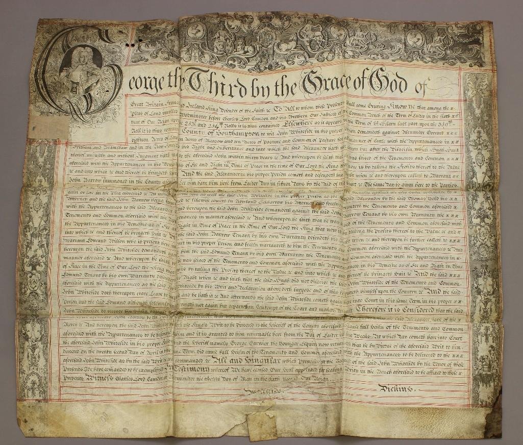 Sold1770 Huge Vellum George III Portrait Beautifully PennedA large vellum manuscript document from the eleventh year of the reign of George III (1770) regarding a judgement of a land dispute pertaining to property in Chobham and Windlesham in the County of SuSee Sold Price