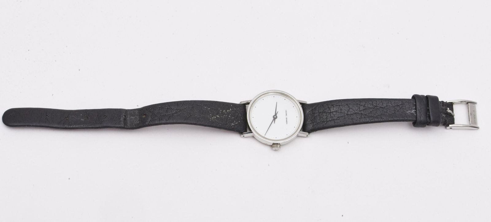 SoldGeorg Jensen 321 Watch Designed by Henning Koppel (1918-1981)A Georg Jensen 321 Watch Designed by Henning Koppel (1918-1981) for Georg Jensen, Having black stainless steel case, white dial with black indexes, leather strap, Quartz movement. 32mm case. Case markSee Sold Price