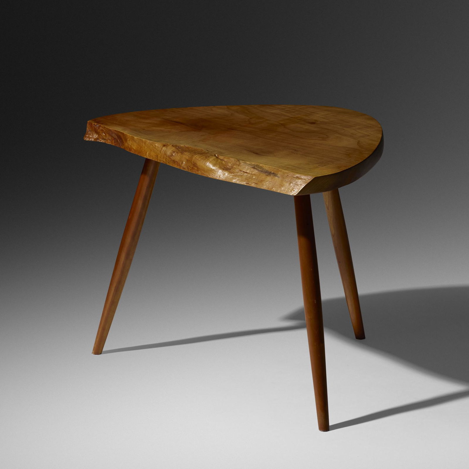 SoldGeorge Nakashima, Wepman Table, Free Edge TopGeorge Nakashima (1905-1990). Wepman or Wohl walnut end table. Thick shaped triangular free edge top with rosewood butterfly joint. Three tapered legs. The underside, George Nakashima signed and datedSee Sold Price