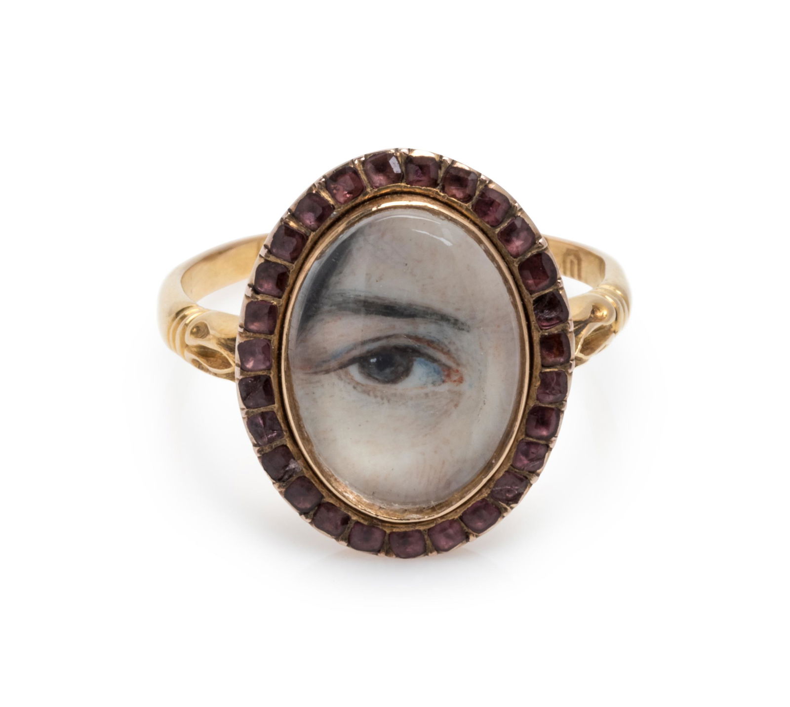 AN ANTIQUE GEORGIAN GARNET RING in yellow gold, set with a cabochon garnet to trifurcated shoulde...AN ANTIQUE GEORGIAN GARNET RING in yellow gold, set with a cabochon garnet to trifurcated shoulders, with the initials D & A engraved to the back, no assay marks, size O / 7.25, 2.9g. Guaran