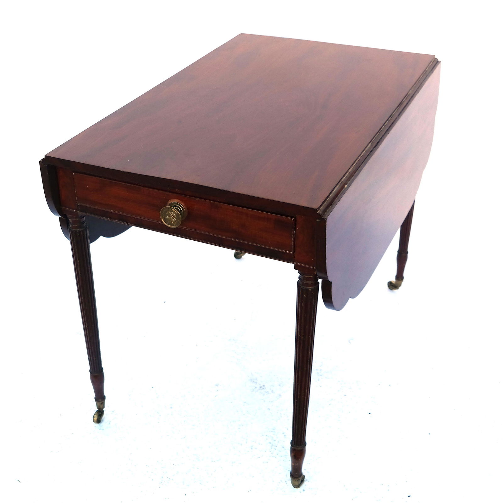 SoldGeorgian-Style Pembroke TableMahogany Georgian-style Pembroke table with reeded legs, on casters. [29"H x 23 1/2" W x 36" D (closed); Leaves: 11 3/4" W]. Shrinkage crack in drawer; scratches; wear.See Sold Price