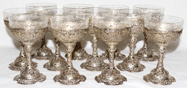 GERMAN .800 SILVER & ETCHED CRYSTAL GOBLETS,
