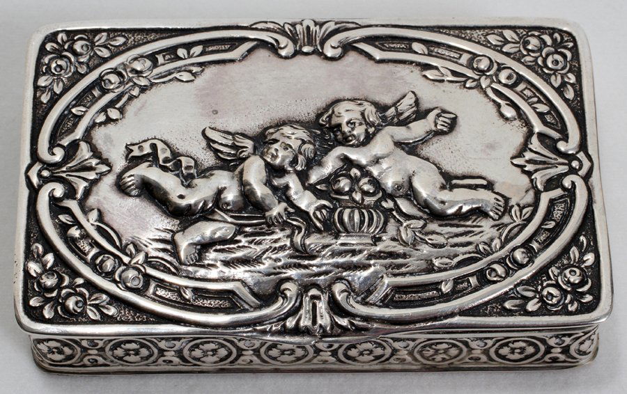 Vintage Silver Plate Jewelry Box7 days LeftA Dutch Silver Snuff BoxMar 11, 2026German Silver BoxMar 12, 2026German Silver BoxMar 14, 2026Silverplated Dresser Box15 hrs LeftRUSSIAN SILVER CIGARETTE CASE, ALEXANDER II, fr. SOTHEBY'sMar 21, 2026American Silver-Tone Metal Cigarette Case21 hrs LeftRare Art Nouveau 800 Sterling Silver Box by M & K Germany7 days LeftRare Art Nouveau 800 Sterling Silver Box by M & K Germany13 hrs LeftGorham Art Nouveau Sterling Silver Cigar Card Box 1900s18 hrs LeftGorham Art Nouveau Sterling Silver Cigar Card Box 1900sMar 14, 2026Elegant Eight-Piece German 800 Silver Card Holders Set5 days LeftContinental Metal Card Case with Mythological Relief, Stamped “Victoria,?? Possibly Silver, circa24 hrs Left.800 Silver Repousse Galante Scene Snuff BoxMar 28, 2026.800 Silver Repousse Galante Scene Snuff BoxMar 28, 2026German Silver Till Box3 days Left