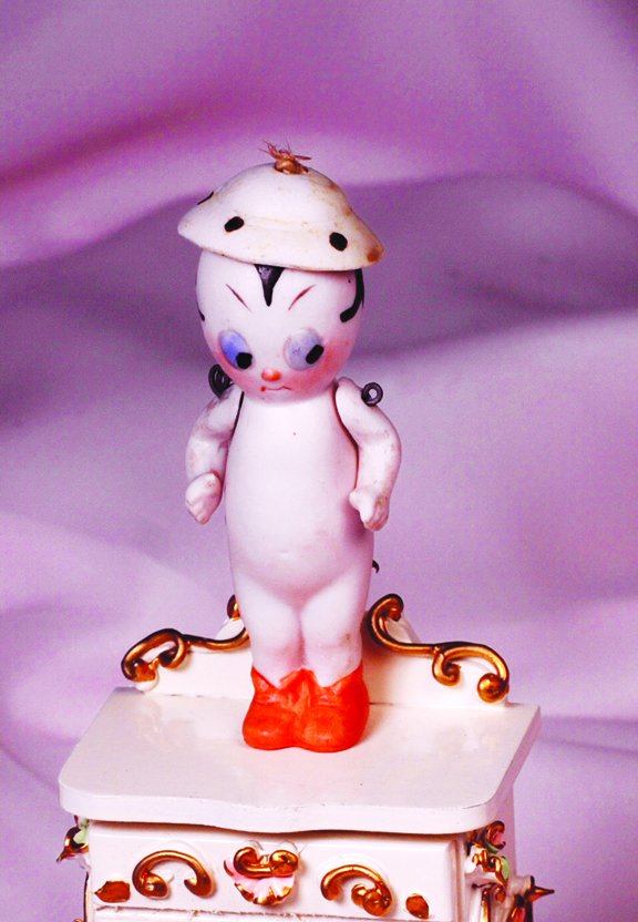 GERMAN ALL-BISQUE GOOGLY WITH MOVEABLE HAT. 3 ½".