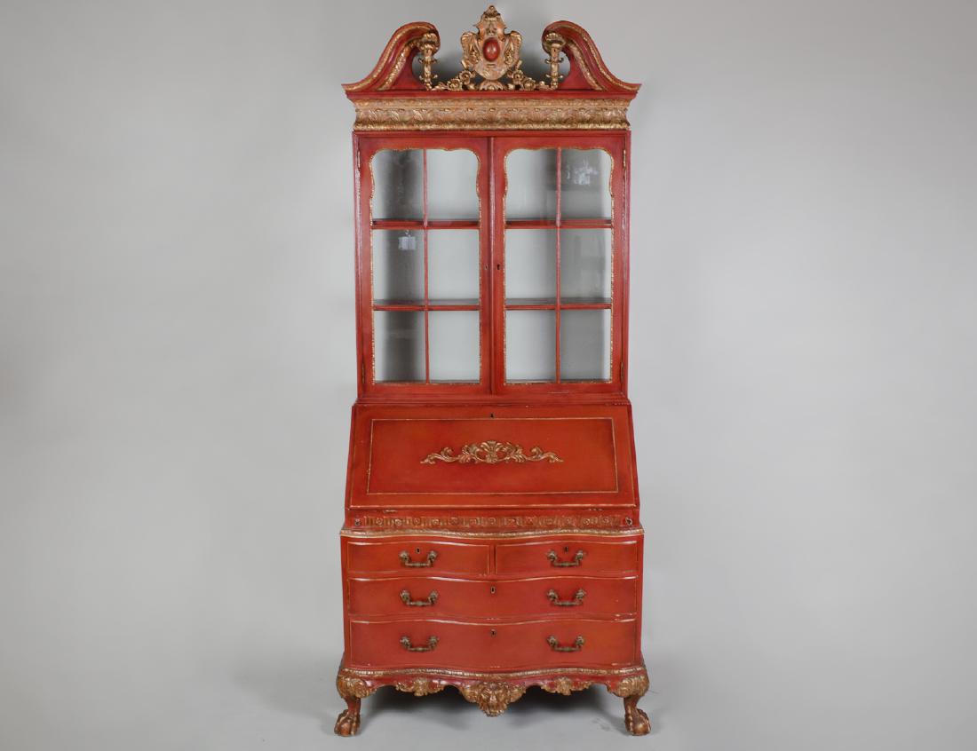 GERMAN BAROQUE STYLE RED LACQUER BUREAU BOOKCASE
