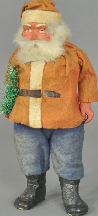 SoldGerman composition Belsnickle candy containerEarly German painted composition Belsnickle candy container, with a felt coat with mica covered snow patches, and a feather tree sprig, 8'' h.See Sold Price