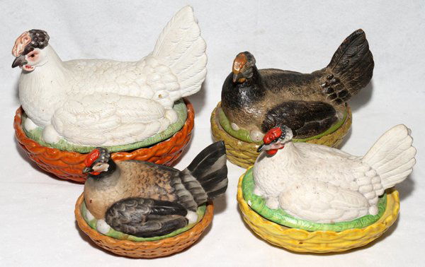 GERMAN BISQUE HEN DISHES, 19TH C., FOUR