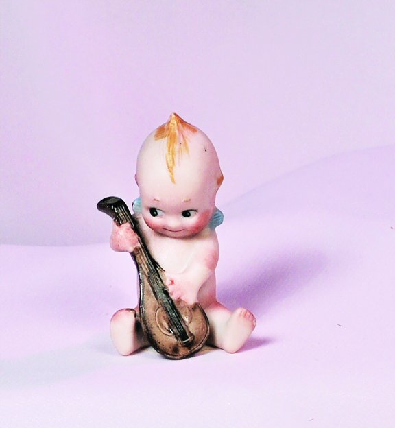 GERMAN BISQUE KEWPIE WITH MANDOLIN. 2 ¼". Seate