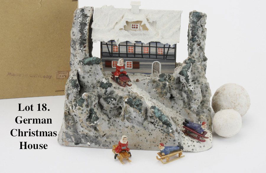 SoldChristmas house, papier mâché, withChristmas house, papier mâché, with figures, electrical light up, width: 38 cm, height: 24 cm German Description Weihnachtshäuschen, Papiermaché, mit Figuren, elektr. beleuchtSee Sold Price