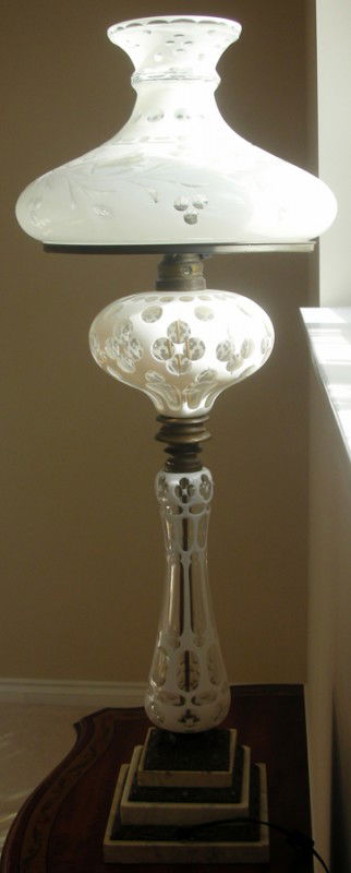 GERMAN CRYSTAL WHITE OVERLAY LAMP, C. 1850,