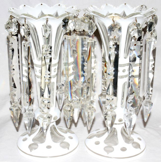 GERMAN CRYSTAL WHITE OVERLAY LUSTRES, PAIR,