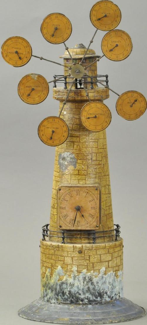 SoldDoll & Cie Lighthouse with Moat & Two BoatsGerman - 1910 - 15" T This toy is in excellent and bright condition. Two flags are replaced. It can be either hand cranked or used as a live-steam attachment. The boats glide up and down, simulating tSee Sold Price