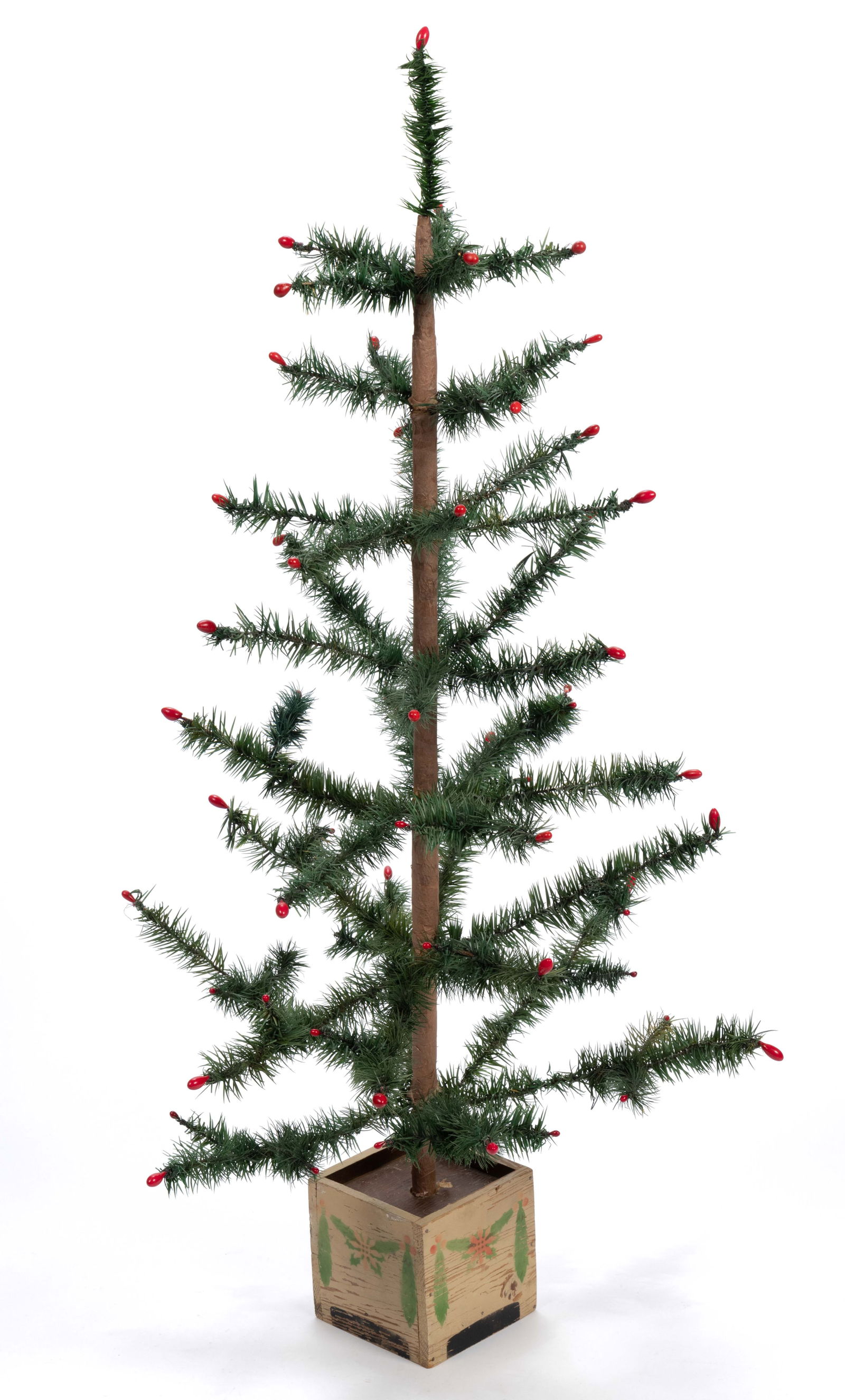 SoldGERMAN LARGE FEATHER CHRISTMAS TREEGERMAN LARGE FEATHER CHRISTMAS TREE, green, set into a red- and green-stenciled wood box-form base, stamped to the underside "Made in Germany", having some faux decorative berries,See Sold Price