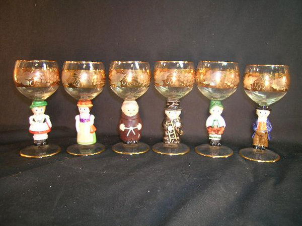 GERMAN FIGURAL HAND PAINTED WINE STEM GLASSES 6 pc