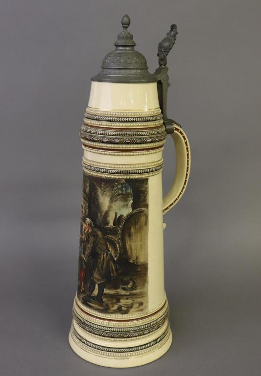 SoldLARGE 4-LITER GERMAN STEINGERMAN 4-LITER BEER STEIN WITH PEWTER LID DEPICTING FIGURES IN TAVERN PUB SCENE (LID HAS SOME DENTS) 8" x 20"See Sold Price
