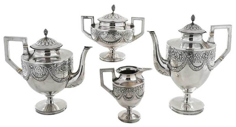 (Lot of) 3 Sterling Silver Service Items, 2 by Emil Hermann6 days LeftWilliam Hunter 1842 Sterling Teapot Set of ThreeFeb 28, 2026A FOUR-PIECE SILVER 'BAMBOO' TEA AND COFFEE SERVICE, MARK OF ZEE WO, SHANGHAI, CIRCA 1870-1925Mar 11, 2026A six piece German 800 standard silver tea and coffee service, Wilhelm Binder, Schwabisch GmundFeb 25, 2026Three Piece Wedgwood International Sterling Coffee SetFeb 25, 2026Four Piece Kirk Sterling Tea Service with TrayFeb 26, 2026A four piece silver tea serviceFour-Piece Durgin Sterling Tea & Coffee ServiceFeb 26, 2026Watson sterling silver 3-piece tea set. Classical urn form with square bases. Monogrammed. TeapotMar 01, 2026Thomas Warner (Baltimore) American Silver Three-Piece Tea Service, c. 1810-1830Mar 08, 2026A Four-piece Silver Tea and Coffee Service, possibly Peruvian5 days LeftGerman Hand Chased Angkor .900 Silver Tea Service SetFeb 26, 2026Frank Smith Sterling "Georgian Garland" Coffee SetFeb 26, 2026Four Piece Chinese Export Silver Tea and Coffee Set, Marked 'C.J'Mar 01, 2026American Aesthetic Silver-Plate Four Piece Coffee Service, late 19th c., Coffee- H.- 12 1/4 in., W.-Feb 27, 2026F.B. Rogers Five-Piece Sterling Silver .925 Tea Set