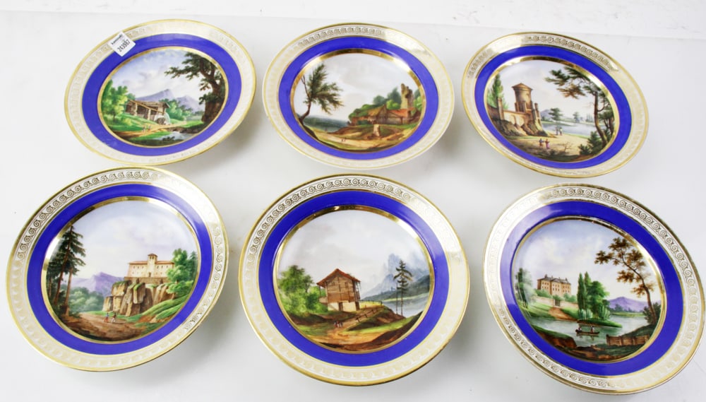 SoldGerman Hand-Painted PlatesGerman hand-painted plates, 9" diameter, (6) total. Two plates with cracks on bottom only. Provenance: Southern Connecticut collection.See Sold Price